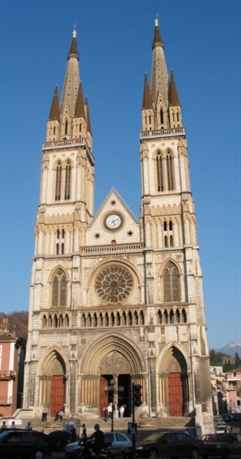 De style néo gothique, ses dimensions sont monumentales (ses deux flèches très visibles sont emblématiques de la ville). Elle présente la particularité d'être construite selon les nouvelles techniques du ciment moulé du XIXème siècle, alliées aux techniques traditionnelles de la pierre de taille. La toiture est couverte de tuiles vernissées polychromes. Elle possède des vitraux remarquables.