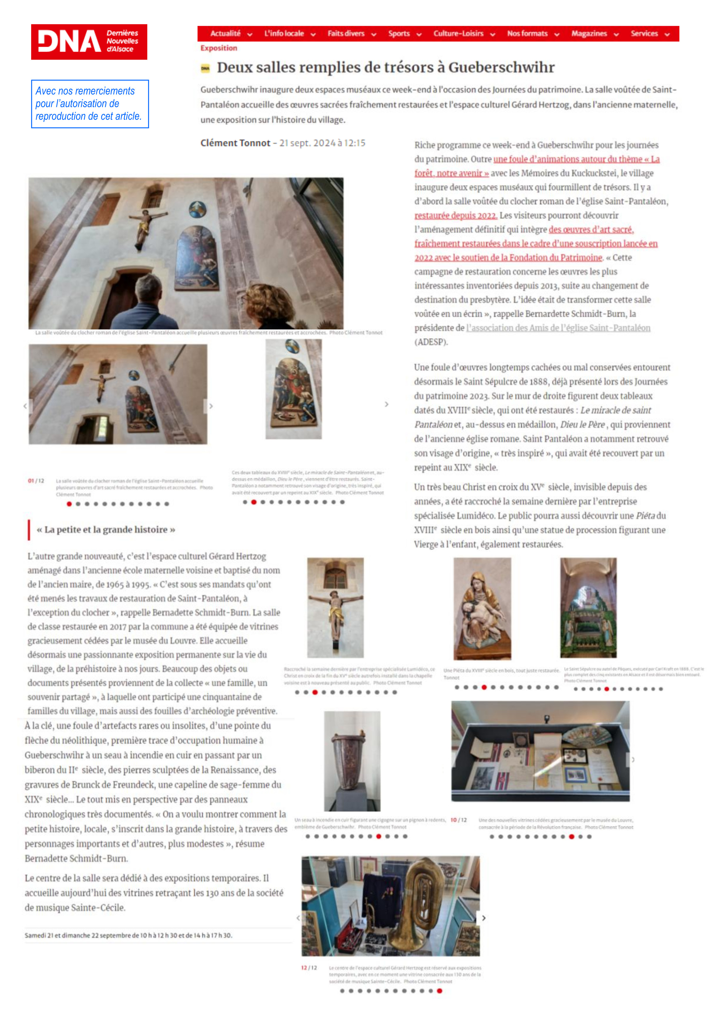 Article paru dans DNA le 21 septembre 2024, concernant l'espace muséal aménagé dans la tour-clocher de l'église St Pantaléon à Gueberschwihr (68). Diffusion sur le site de l'ASSOCIATION DES AMIS DE L'EGLISE SAINT-PANTALEON, rubrique "2024" :