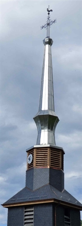 - Phase II : travaux de réfection de la flèche du clocher avec reprise des bois abîmés de charpente, reprise des abat-sons de la partie haute en bois de mélèze, réfection de la flèche en cuivre étamé, réfection de la croix et du coq.