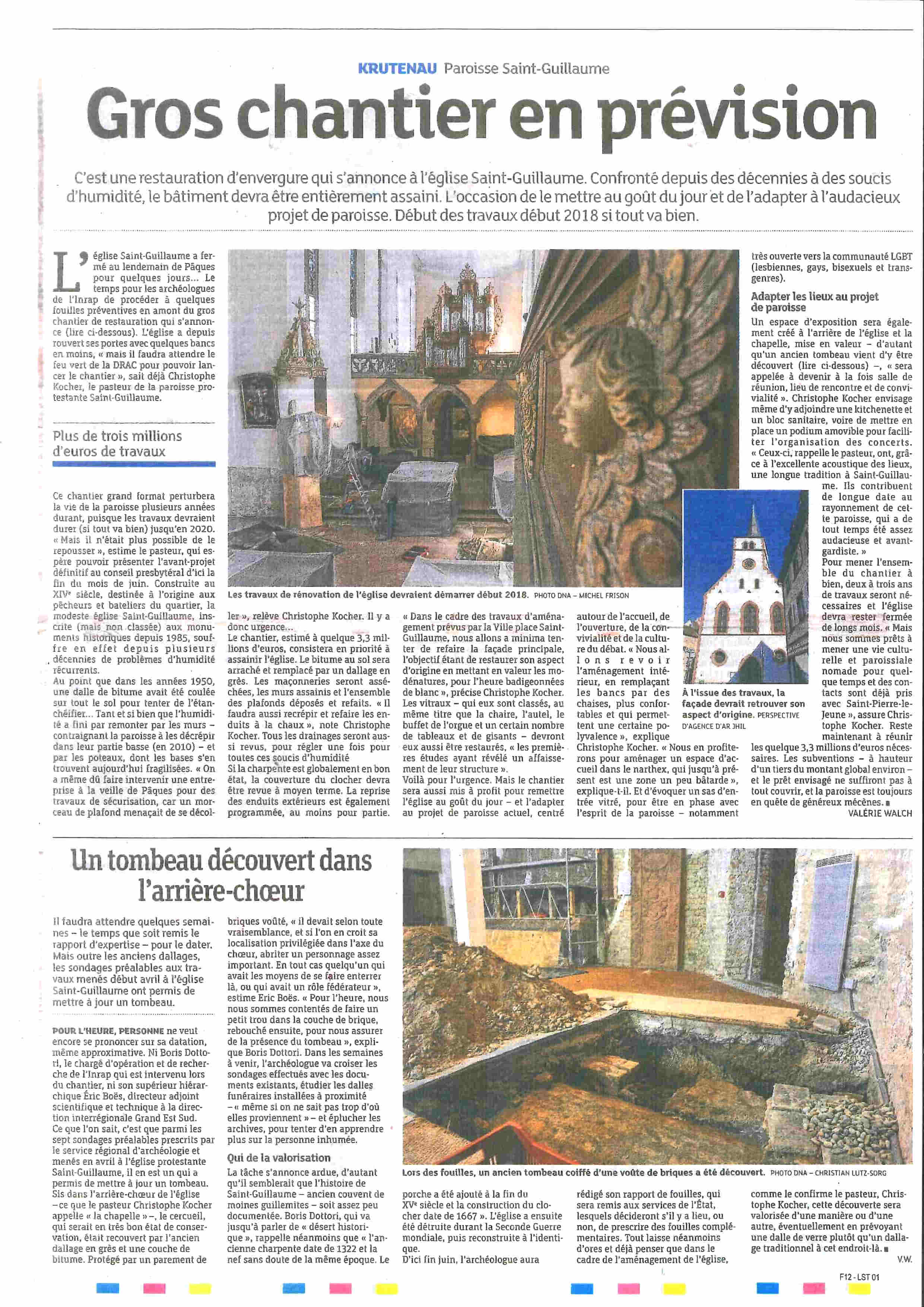Article de presse paru le 10 mars 2018 dans DNA Strasbourg, concernant le démarrage des travaux restauration de l'église St Guillaume.