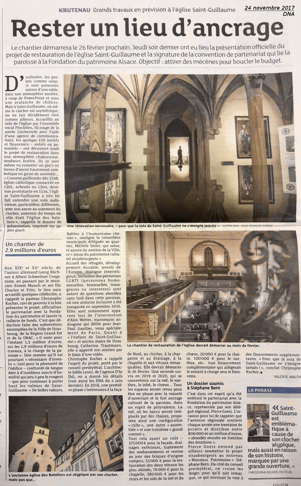 Article de presse paru le 24 novembre 2017 dans DNA Strasbourg, concernant la présentation officielle du projet de restauration de l'église St Guillaume et son financement.