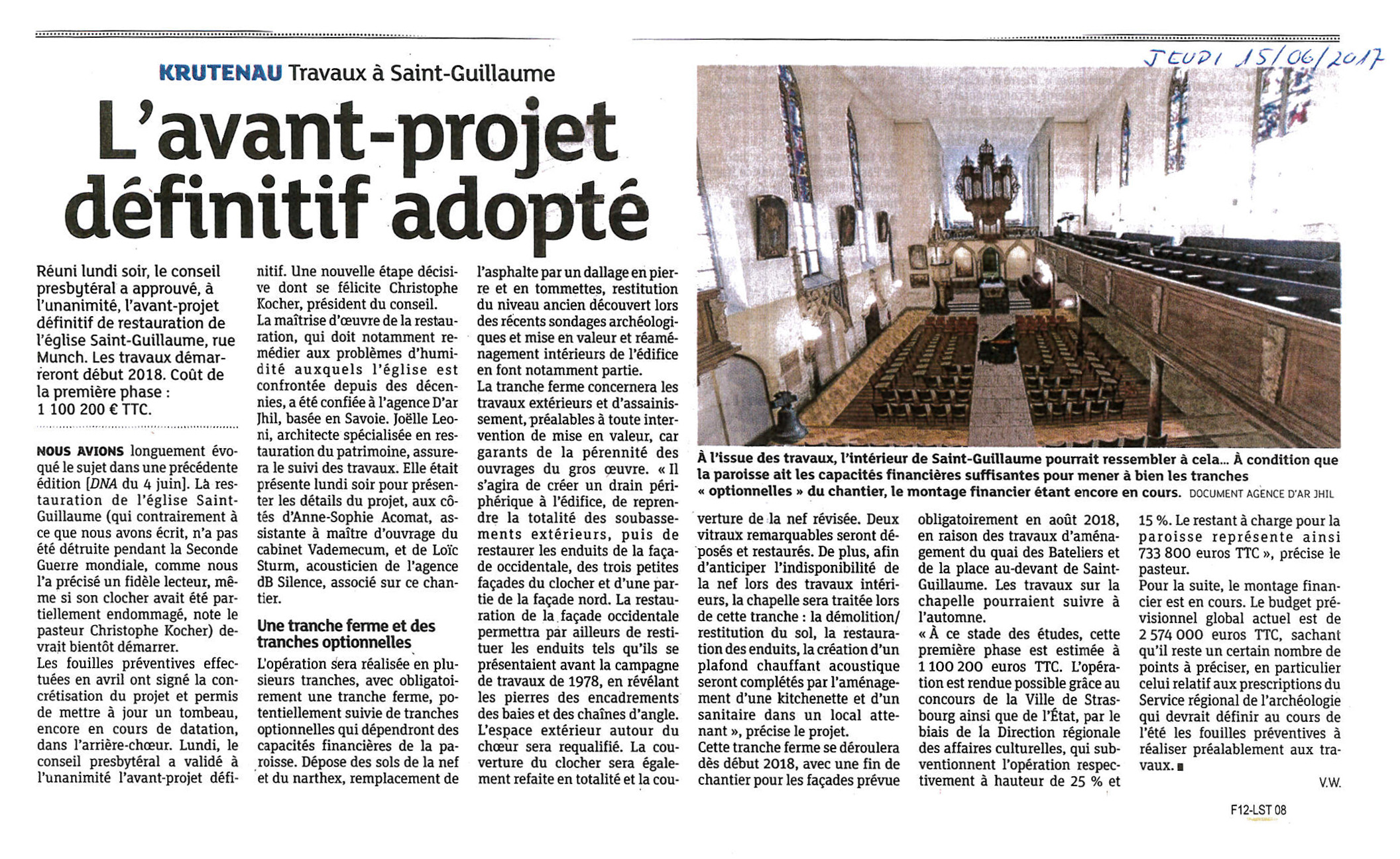Article de presse paru le 15 juin 2017 dans DNA Strasbourg, concernant l'approbation de l'avant-projet définitif de l'église St Guillaume.